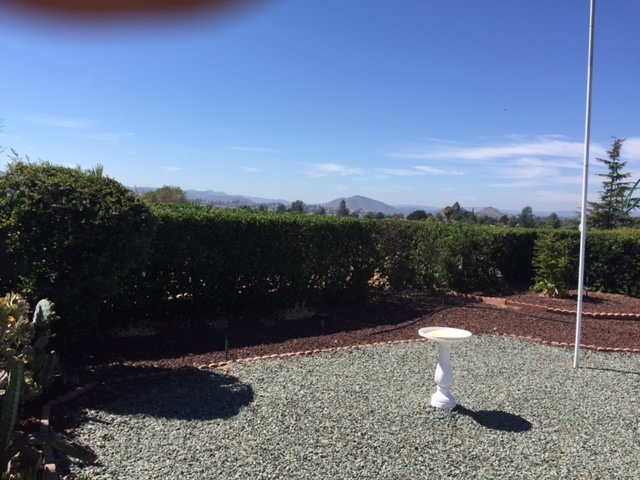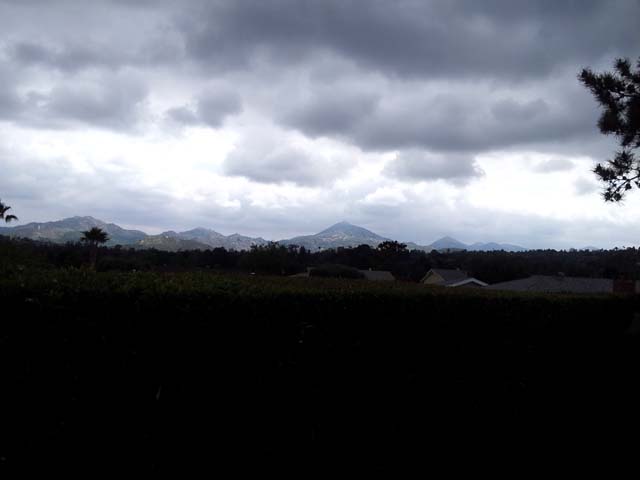 View looking east, over a hedge -- unusually cloudy day.